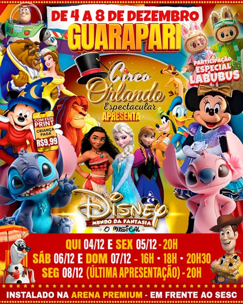De quinta dia 04/12 à segunda dia 08/12 show Disney criança paga R$9,99 com bônus ou print, acompanhada de 1 adulto pagante inteira. promoção válida somente para lateral e central